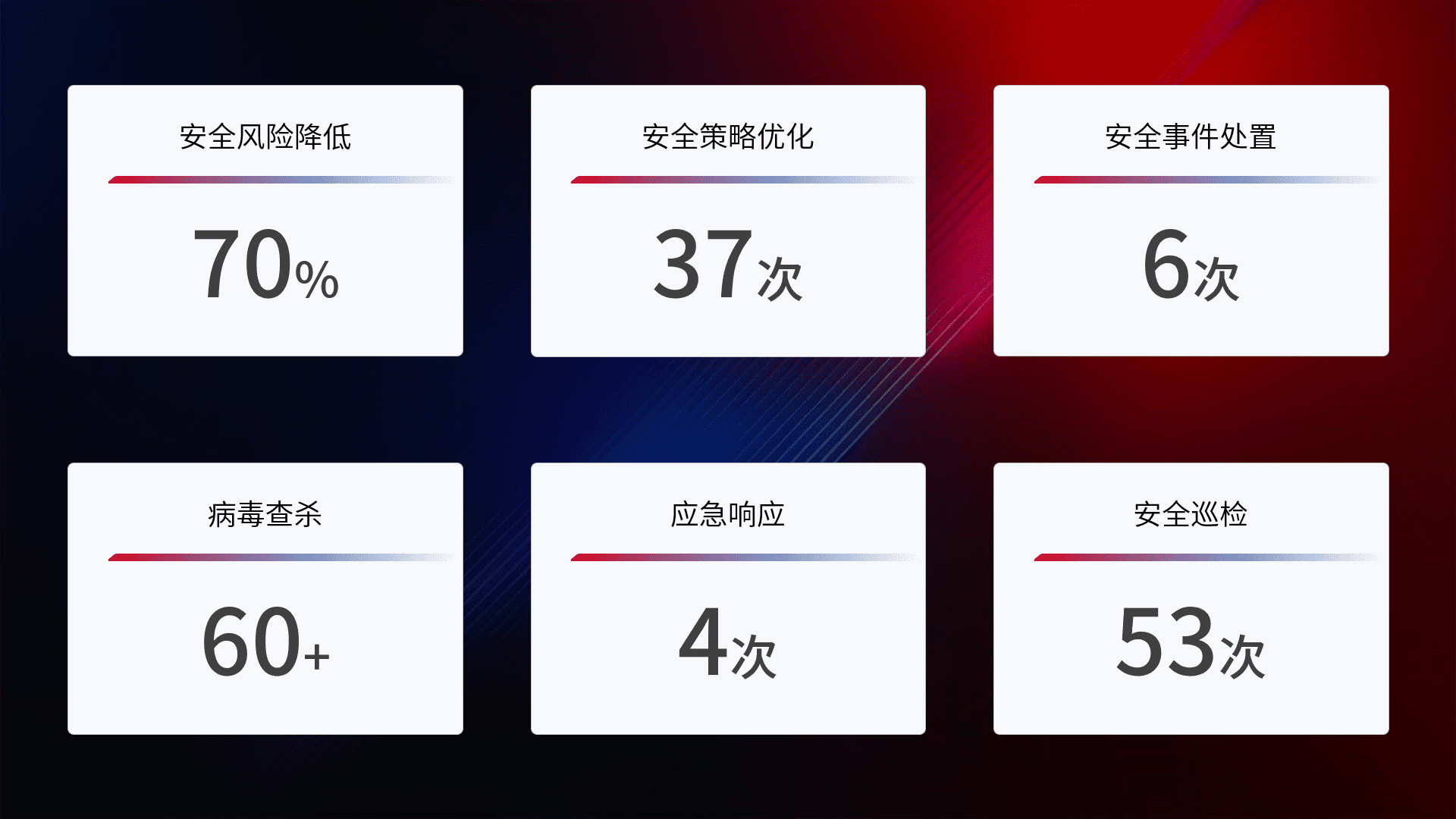 提供全面的安全事件报告体系,,,包括处置报告、、、周报、、、季度和年度总结,,结合持续监控,,帮助客户深入了解网络安全状况。。